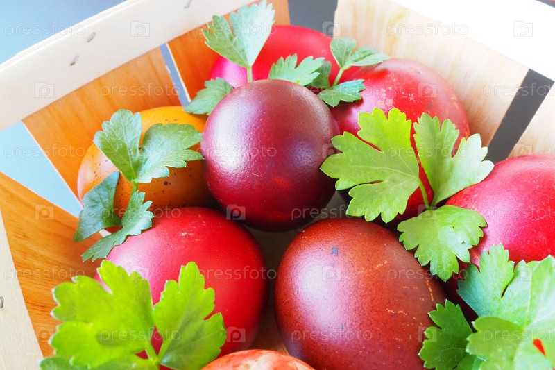 Пасхальная корзина крупным планом с красочными яйцами. Вареные куриные яйца с красной и коричневой скорлупой, окрашенные луковой шелухой по традиционному рецепту. Листья свежей зелени петрушки. Серый фон