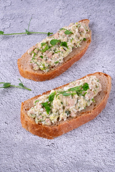Брускетта с печенью трески, вареными яйцами, зеленым луком на пшеничном хлебе на сером столе