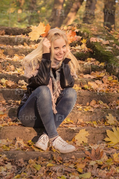 Счастливая девушка в осеннем парке улыбается, тонированное изображение
