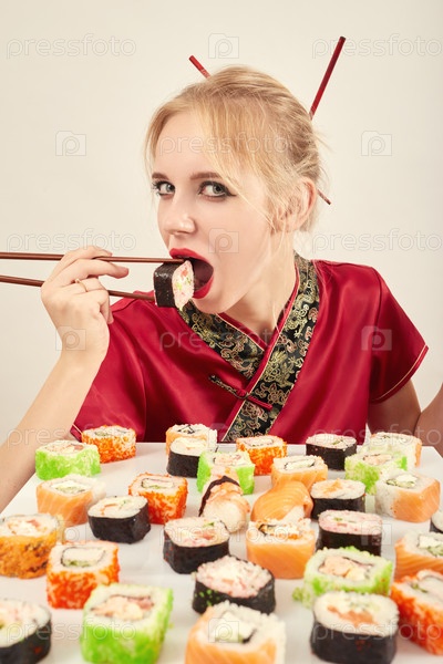 Девушка ест суши
