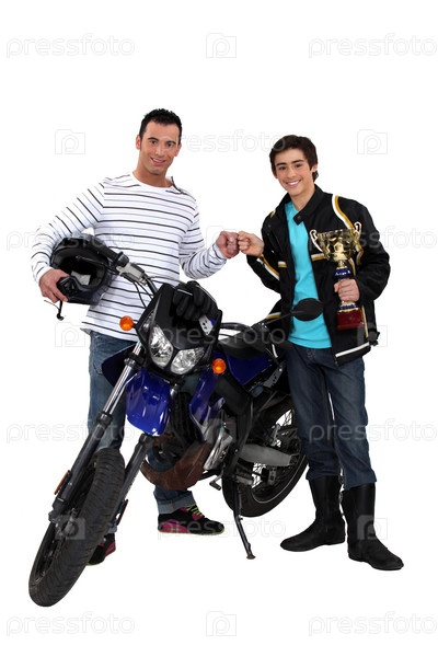 Мужчины с мотоциклом и золотым кубком