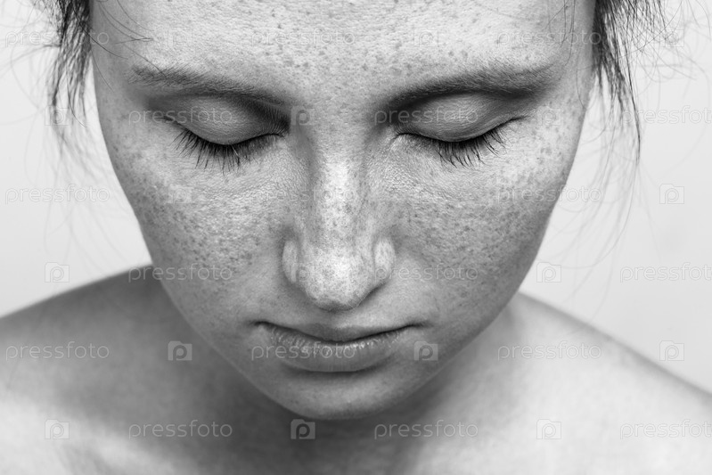 Молодая женщина с веснушками естественной красоты макияж выглядит крупным планом портрет, монохромный