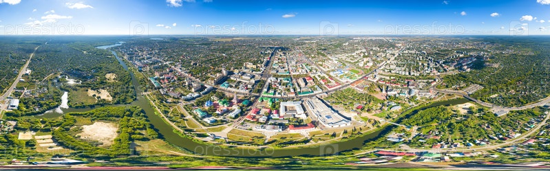 Тамбов, Россия. Панорама города с воздуха летом. Ясная погода с облаками. Панорама 360, вид с воздуха