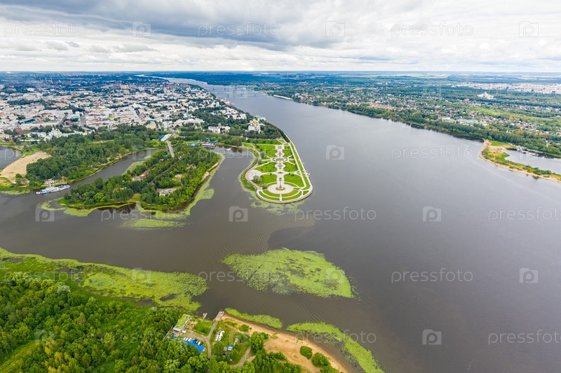 Ярославль, Россия. Парк на Косе (Косе). Панорамный вид на город. Которосль впадает в Волгу. Облачная погода. С высоты птичьего полета