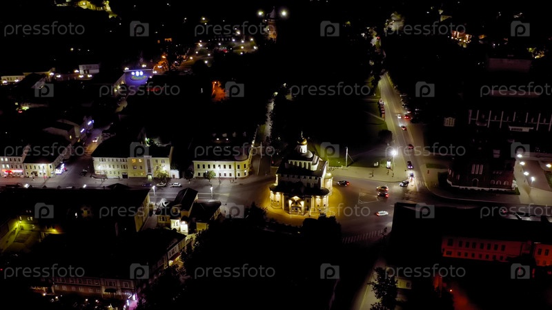 Россия, Владимир. Ночной город с воздуха. Золотые ворота (Владимир), вид с воздуха