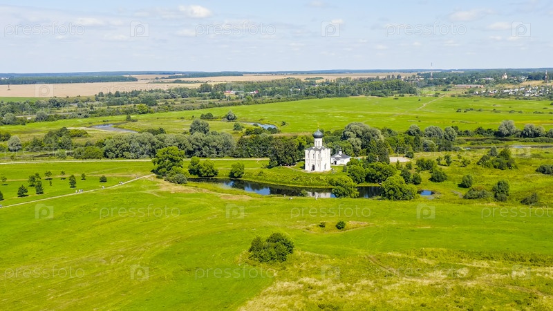 Россия, Боголюбово. Вид с воздуха на церковь Покрова на Нерли. Православная церковь и символ средневековой России, вид с воздуха