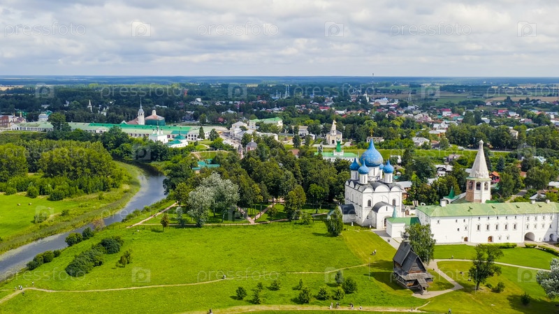 Суздаль, Россия. Полет. Собор Рождества Богородицы в Суздале - православный храм на территории Суздальского кремля, вид с воздуха