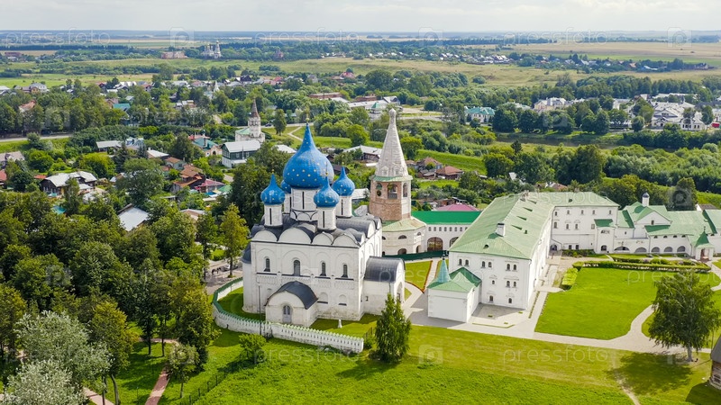 Суздаль, Россия. Полет. Собор Рождества Богородицы в Суздале - православный храм на территории Суздальского кремля, вид с воздуха