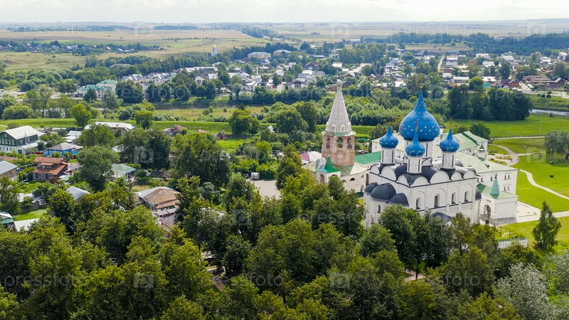 Суздаль, Россия. Полет. Собор Рождества Богородицы в Суздале - православный храм на территории Суздальского кремля, вид с воздуха