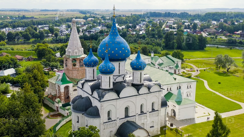 Суздаль, Россия. Полет. Собор Рождества Богородицы в Суздале - православный храм на территории Суздальского кремля, вид с воздуха
