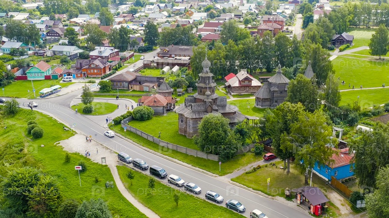 Суздаль, Россия. Полет. Преображенская церковь из села Козлятево, перевезенная в Суздаль - памятник деревянного зодчества середины 18 века, вид с воздуха
