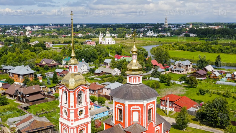 Суздаль, Россия. Полет. Церковь Святых Бориса и Глеба (Борисоглебская) и церковь Ильи Пророка (Ильинская), вид с воздуха