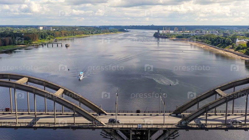 Рыбинск, Россия. Рыбинский мост. Мост через реку Волга, расположенный в городе Рыбинске Ярославской области, вид с воздуха