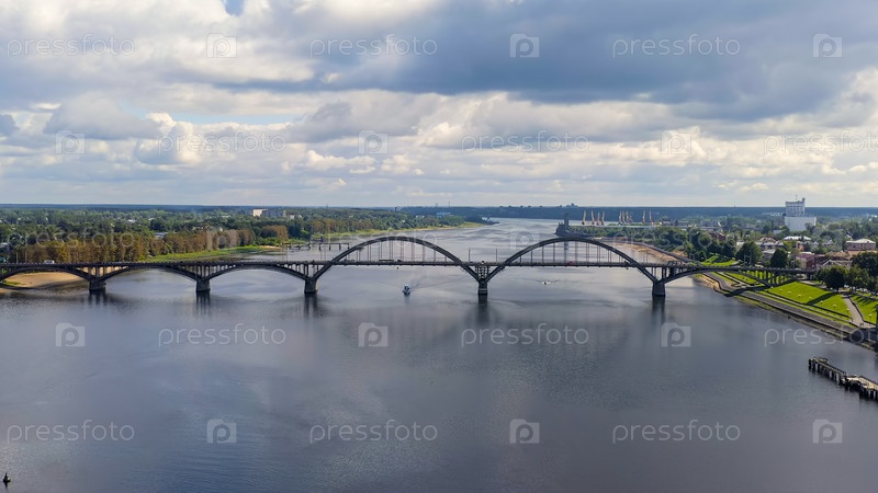 Рыбинск, Россия. Рыбинский мост. Мост через реку Волга, расположенный в городе Рыбинске Ярославской области, вид с воздуха
