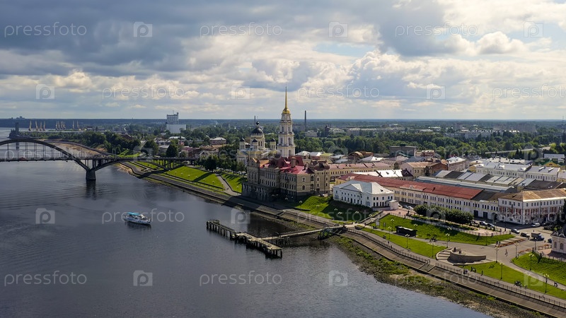 Рыбинск, Россия. Здание бывшей хлебной биржи и набережная реки Волги. Спасо-Преображенский собор, вид с воздуха