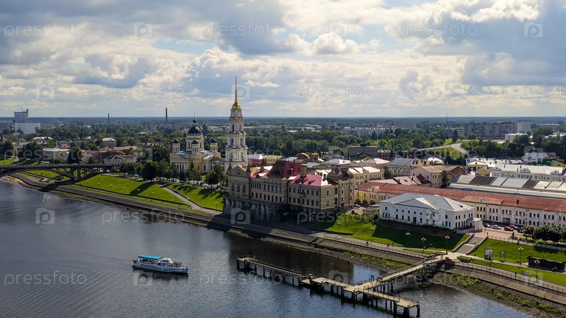Рыбинск, Россия. Здание бывшей хлебной биржи и набережная реки Волги. Спасо-Преображенский собор, вид с воздуха