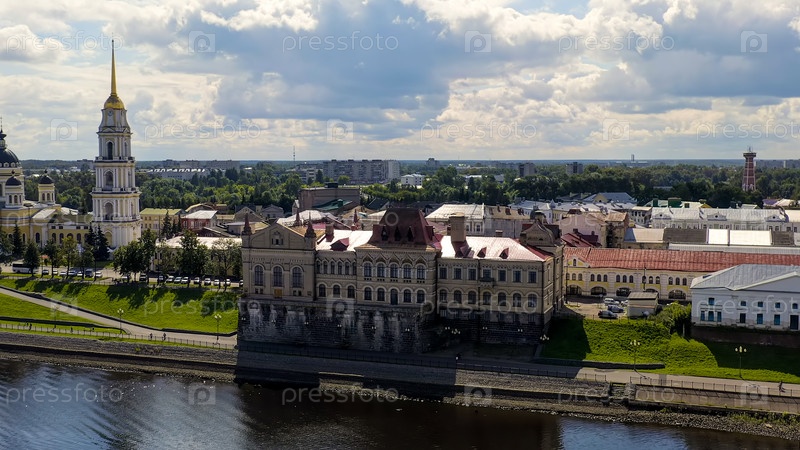 Рыбинск, Россия. Здание бывшей хлебной биржи и набережная реки Волги. Спасо-Преображенский собор, вид с воздуха