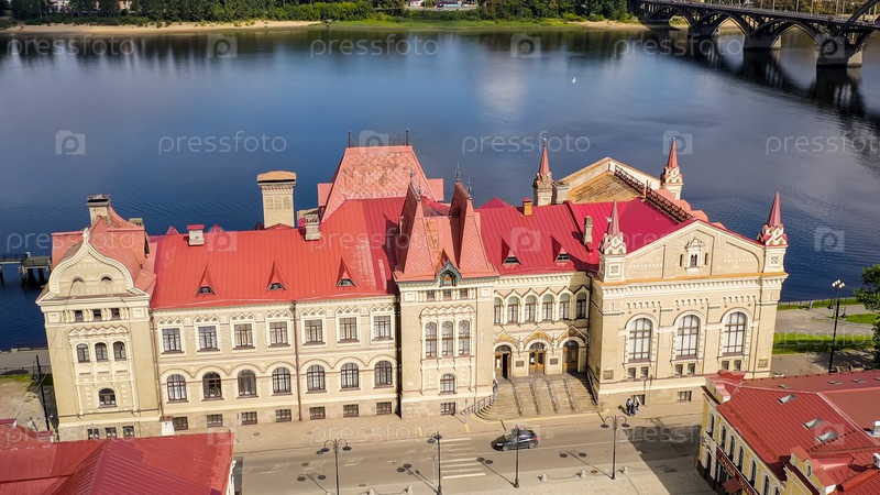Рыбинск, Россия. Здание бывшей хлебной биржи и набережная реки Волги, вид с воздуха