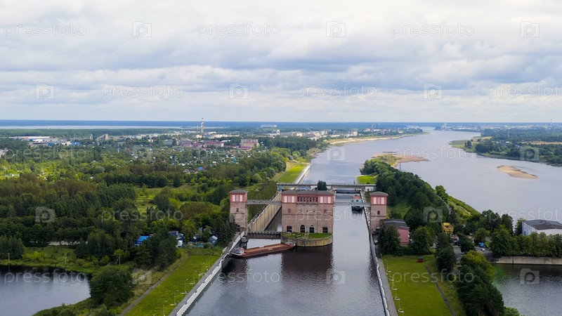 Рыбинск, Россия. Система запирания Рыбинского водохранилища, вид с воздуха