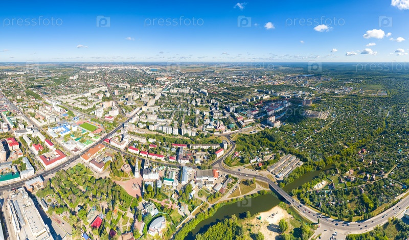 Тамбов, Россия. Панорама города с воздуха летом. Ясная погода с облаками. С высоты птичьего полета