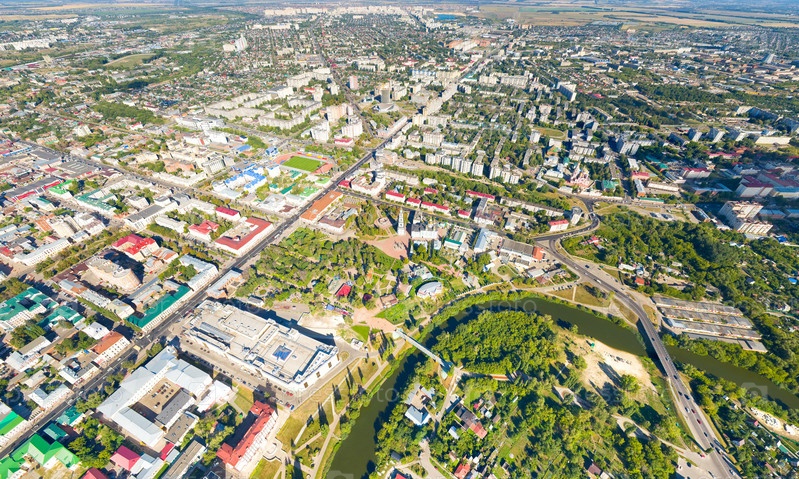 Тамбов, Россия. Панорама города с воздуха летом. Ясная погода с облаками. С высоты птичьего полета