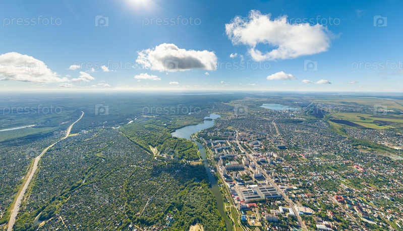 Тамбов, Россия. Панорама города с воздуха летом. Ясная погода с облаками. С высоты птичьего полета