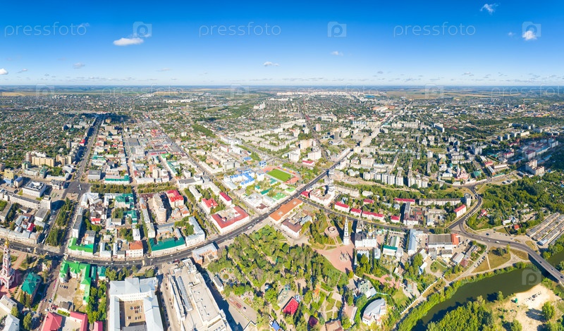 Тамбов, Россия. Панорама города с воздуха летом. Ясная погода с облаками. С высоты птичьего полета