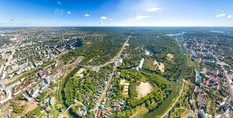 Тамбов, Россия. Панорама города с воздуха летом. Ясная погода с облаками. С высоты птичьего полета