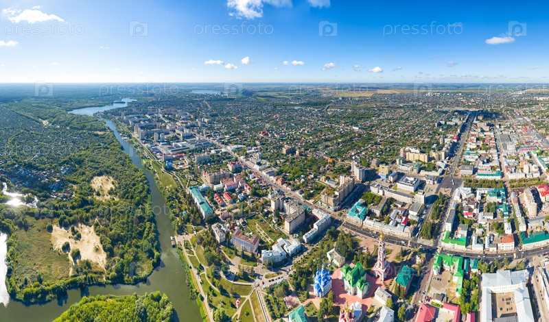 Тамбов, Россия. Панорама города с воздуха летом. Ясная погода с облаками. С высоты птичьего полета