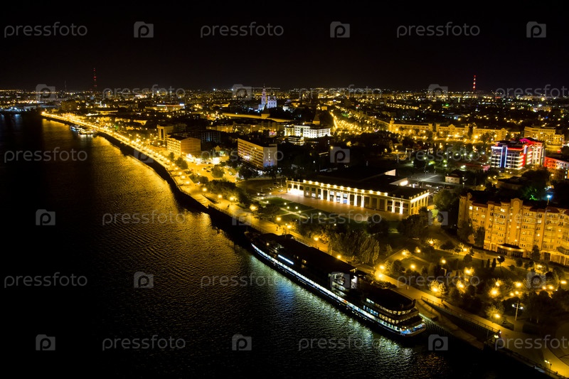 Астрахань, Россия. Набережная реки Волги. Круизный лайнер у причала. Огни ночного города. С высоты птичьего полета