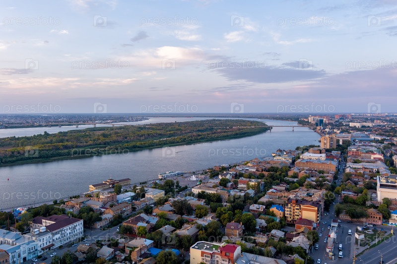 Астрахань, Россия. река Волга. Городской остров. Панорама города с воздуха летом. Время заката. С высоты птичьего полета