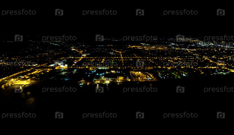 Астрахань, Россия. Панорама города с воздуха. Огни ночного города. С высоты птичьего полета