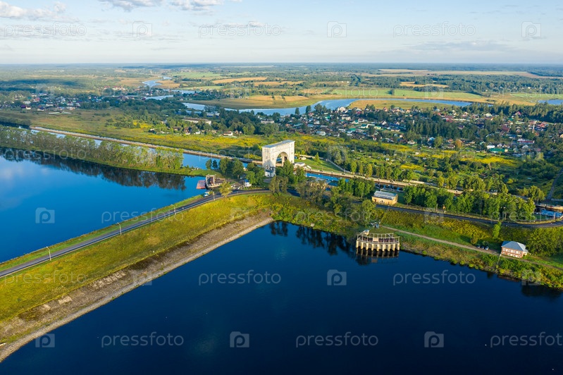 Углич, Россия. Угличский фунтовый замок. Ворота реки Волги. Раннее утро. С высоты птичьего полета