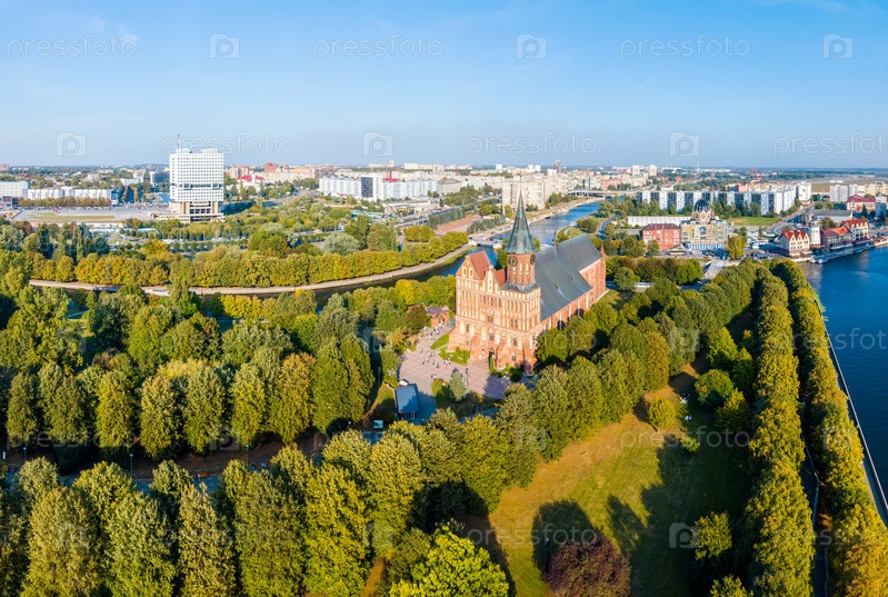 Вид с воздуха Центральная часть города Калининграда, Калининградский собор на острове Канта. Россия