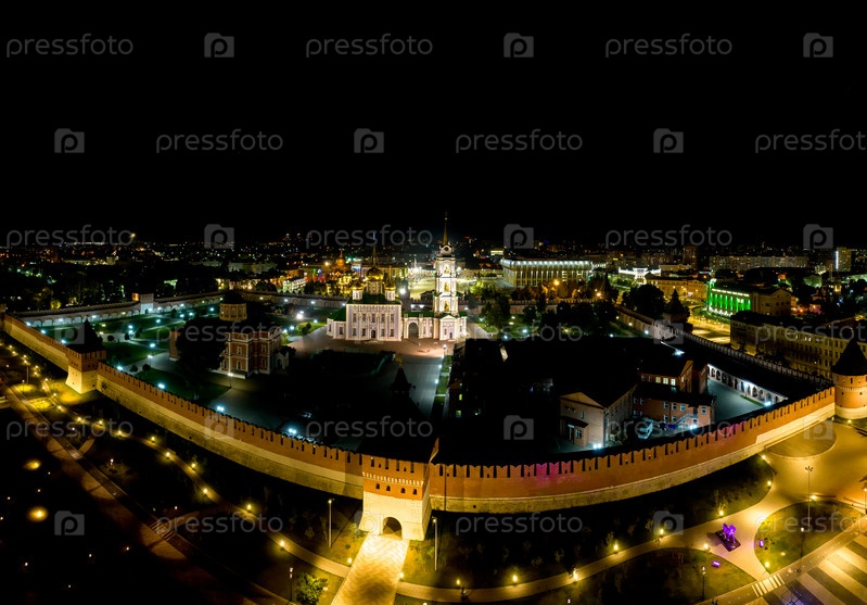 Тула, Россия. Кремль. Ночной вид с воздуха. Успенский собор Тульского Кремля