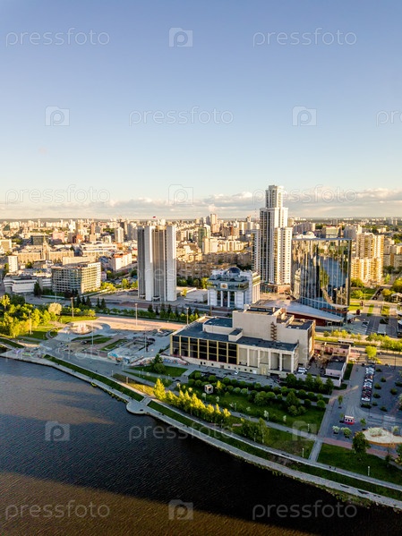 Набережная рядом с драматическим театром, правительственными зданиями. Вид с воздуха (дрон). Екатеринбург, Россия