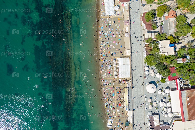 Судак, Крым. Вид на городские пляжи Судака со стороны Черного моря. С высоты птичьего полета