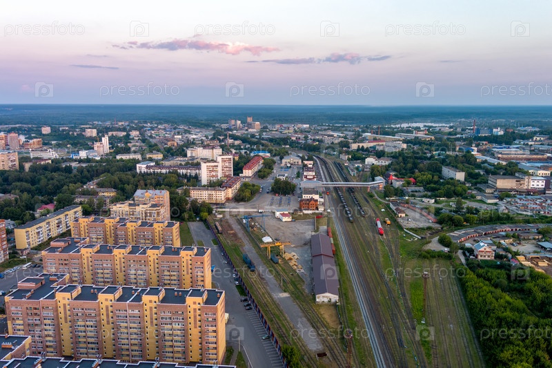 Йошкар-Ола, Россия. Железная дорога. Панорама центра города во время заката. С высоты птичьего полета