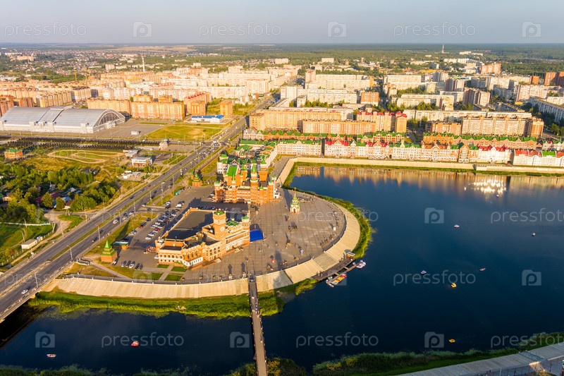 Йошкар-Ола, Россия. Панорама центра города во время заката. С высоты птичьего полета