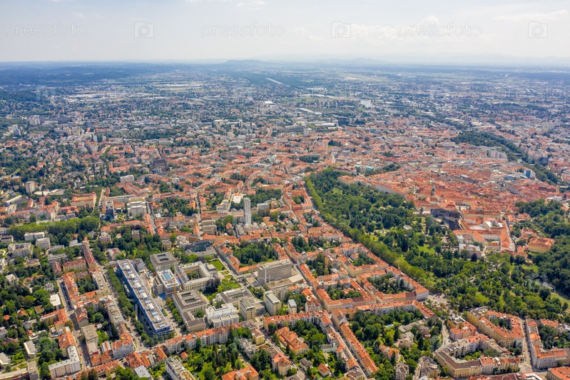 Грац, Австрия. Панорама города. Вид с воздуха на город и его окрестности