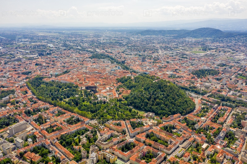 Грац, Австрия. Панорама города. Вид с воздуха на город и его окрестности