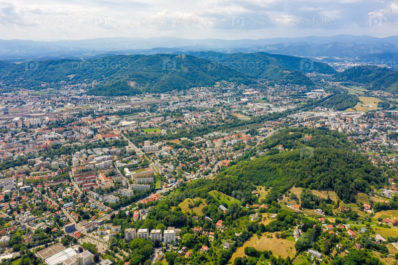 Грац, Австрия. Панорама города. Вид с воздуха на город и его окрестности