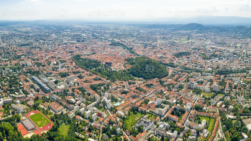 Грац, Австрия. Панорама города. Вид с воздуха на город и его окрестности
