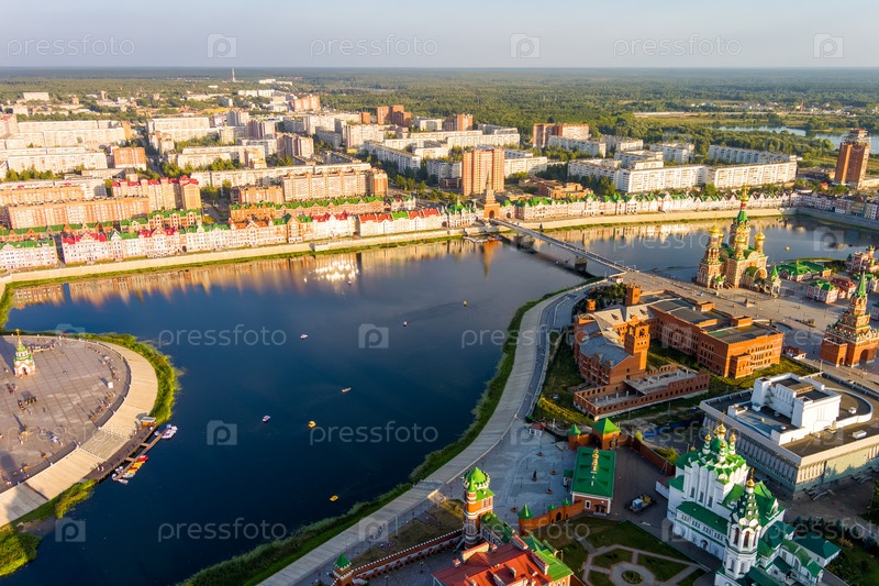 Йошкар-Ола, Россия. Панорама центра города во время заката. С высоты птичьего полета
