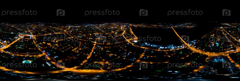 Астрахань, Россия. Аэрофотоснимок ночного города. Уличные фонари. Панорама 360