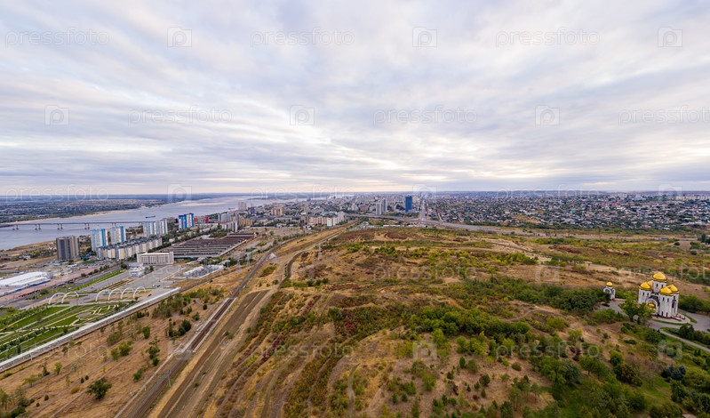 Волгоград, Россия. река Волга. Вид с воздуха во время заката. Падать
