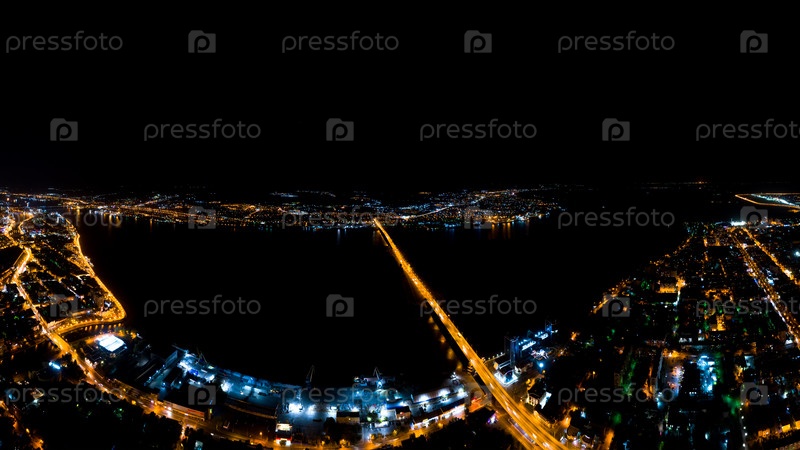 Астрахань, Россия. Аэрофотоснимок ночного города. Астраханский мост. уличные фонари