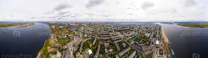 Самара. Россия. Набережная реки Волги с пляжем. Осенний пейзаж. С высоты птичьего полета. Панорама 360