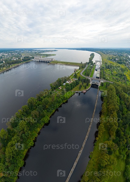 Углич, Россия. Круизный лайнер и сухогруз типа "Волга-Дон" у шлюзовых ворот Угличского водохранилища. Гидроэлектростанция. С высоты птичьего полета