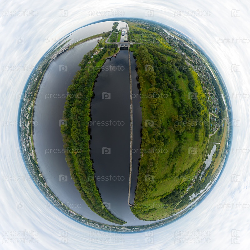 Углич, Россия. Городской и круизный лайнер и сухогруз у шлюзовых ворот Угличского водохранилища. Гидроэлектростанция. 360-градусный панорамный астероид